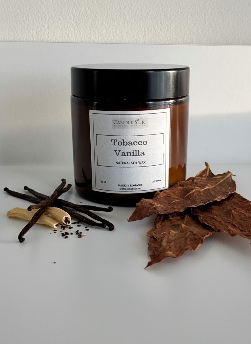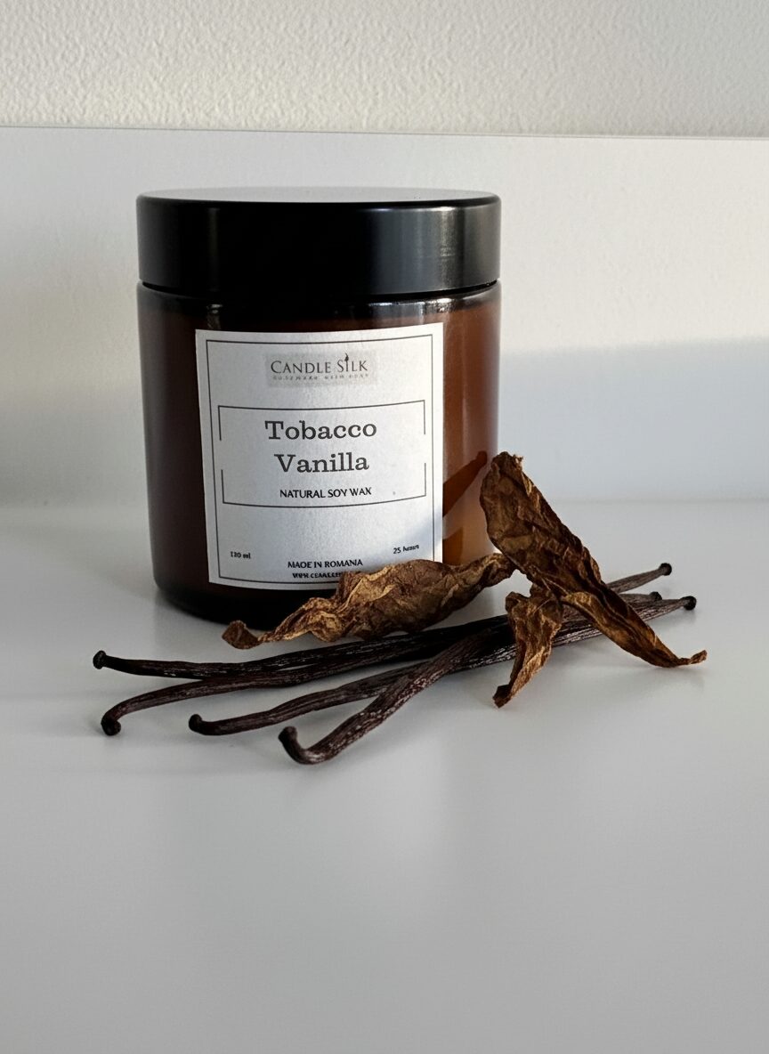 „Descoperiți farmecul lumânării noastre cu parfum de tutun și vanilie, meticulos creată pentru cei care apreciază lucrurile fine ale vieții. Închisă într-un recipient elegant din sticlă neagră cu un capac rafinat, această lumânare de 120 ml este o piesă de declarație pentru orice cameră. Fabricată cu ceară de soia naturală și organică, garantează o ardere curată și ecologică, păstrând puritatea aromei sale captivante.